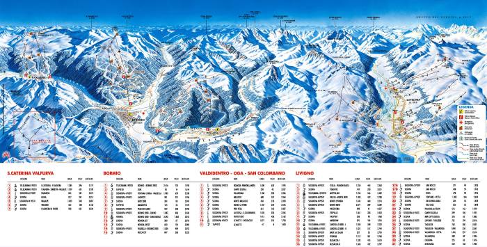V oblasti můžete lyžovat na 225 kilometrech v rámci jednoho skipasu ve skiareálech Livigno, Bormio, Valdidentro / Oga / San Colombano a Santa Caterina. Všechny tyto areály jsou svými kvalitními, propojenými a náročnými sjezdovými tratěmi plně srovnatelné se známými francouzskými středisky. Ať je to třeba Bormio s 10 kilometrovou sjezdovou tratí a převýšením 1780 m, kde naleznete jak ideální podmínky pro lyžování, tak i termální lázně, či oblast S. Caterina s náročnou sjezdovkou Bucaneve, nebo Livigno se svými 115 kilometry sjezdových tratí.