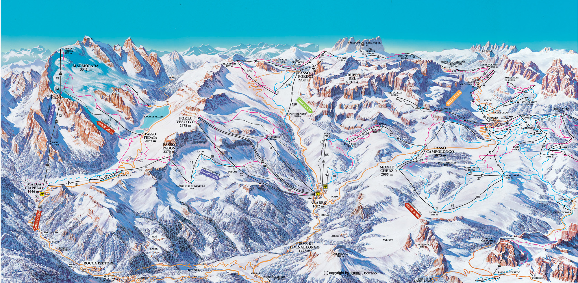 Dominantou celé oblasti je hora Marmolada 3.342 m, která je nejvyšší horou celých Dolomit. Ledovec hory Marmolada je orientován na sever a tudíž celá oblast nabízí možnosti lyžování i v jarním období. Z vrcholu Marmolady si lze vychutnat 12 km dlouhou červenou sjezdovou trať Pista Bellunese, jejíž cíl je v městečku Malga Ciapela. Zpět se dostanete nově zrekonstruovanou kabinovou lanovkou. Arabba a Malga Ciapela dýchají atmosférou pohádkově krásných horských vesniček, které ještě nejsou stále dotčeny masovou turistikou.