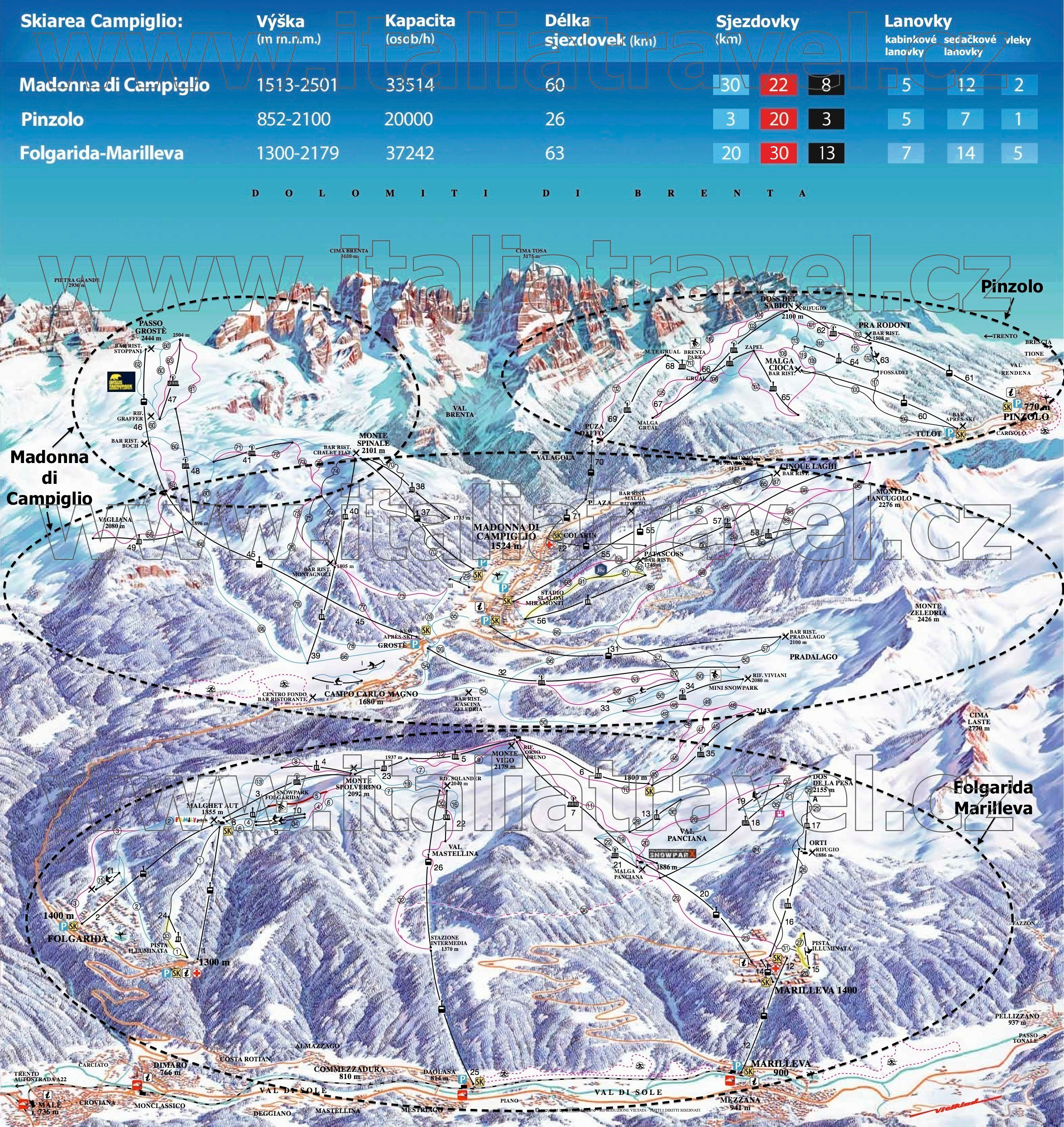 Sjezdovky tohoto centra jsou rychlé, ale bezpečné a jejich členitost nabízí nepřeberné množství variant sjezdů všech náročností, jak pro milovníky lyžování, tak pro stoupence snowboardingu. Pokud si pořídíte rozšířený skipas Skirama, můžete využít i propojení s dalším střediskem oblasti Val di Sole Marilleva/Folgarida. Vrcholem nabídky v Madonně di Campiglio je trať 3-Tre vedoucí z Palou (2123 m n.m.), homologovaná pro závody FIS. Z Passo Grosté (2443 m n.m.), nejznámějšího lyžařského sedla ve Val di Sole, si vychutnáte sedmikilometrový sjezd až k dolní kabinové lanovce, další nezapomenutelné zážitky vám připraví černá tříkilometrová sjezdovka Amazzonia padající ze skalního výběžku Pradalago. Modlou italských vyznavačů snowboardingu je špičkový obří snowpark Ursus na Passo Grosté.