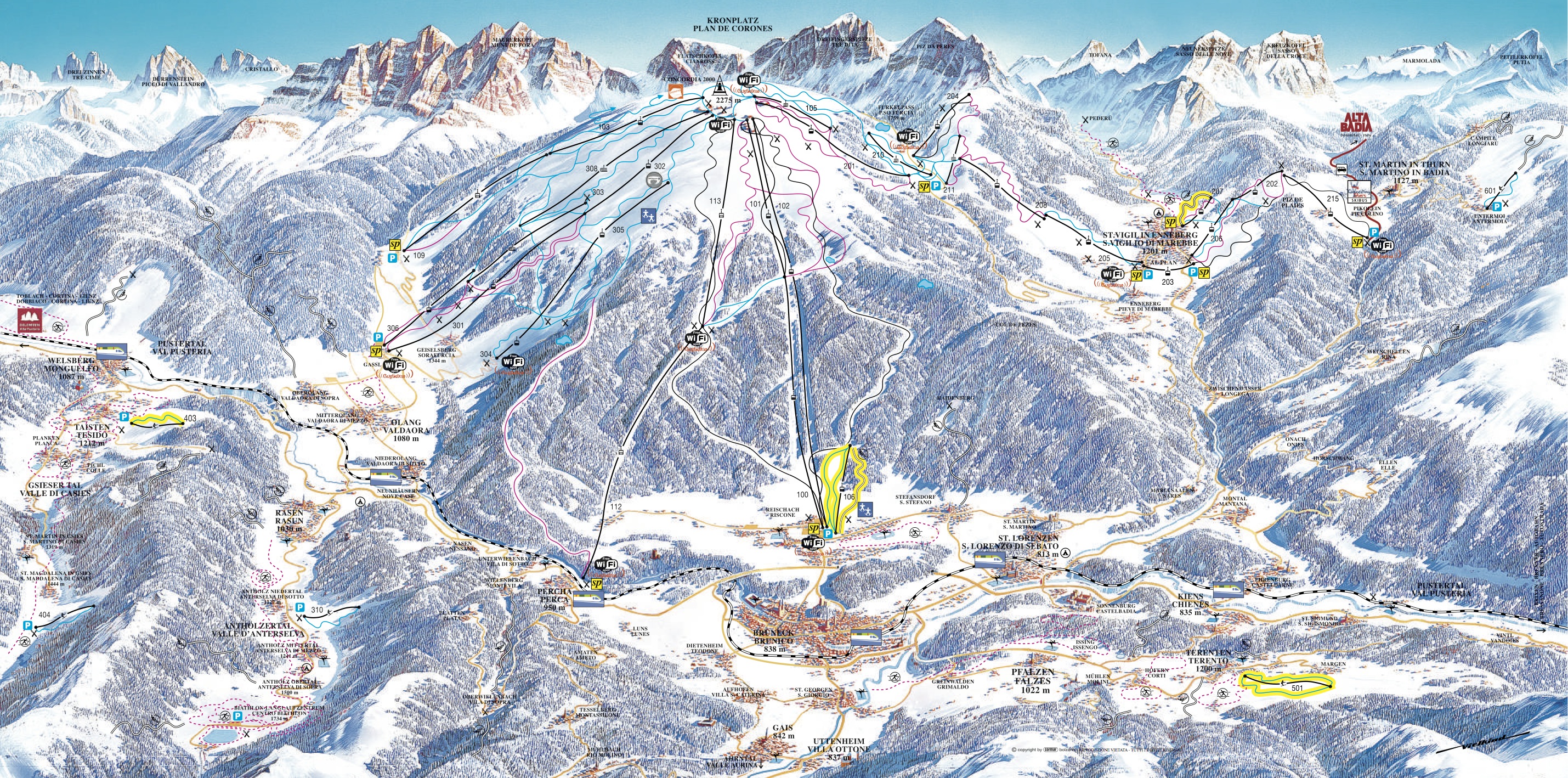Plan de Corones neboli Kronplatz s nadmořskou výškou 2.275 m můžeme označit jako vrchol sněhových radovánek patřící k nejznámějším lyžařským střediskům Dolomity Superski, které nabízí relaxaci, lyžování a perfektní služby. Kronplatz není díky své legendární hoře určen jen pro sjezd na lyžích, ale také pro jízdu na běžkách s více než 200 km lyžařských tras. Nejlepší místo pro alpské lyžaře, snowboardisty, sněhové designéry, sáňkaře.