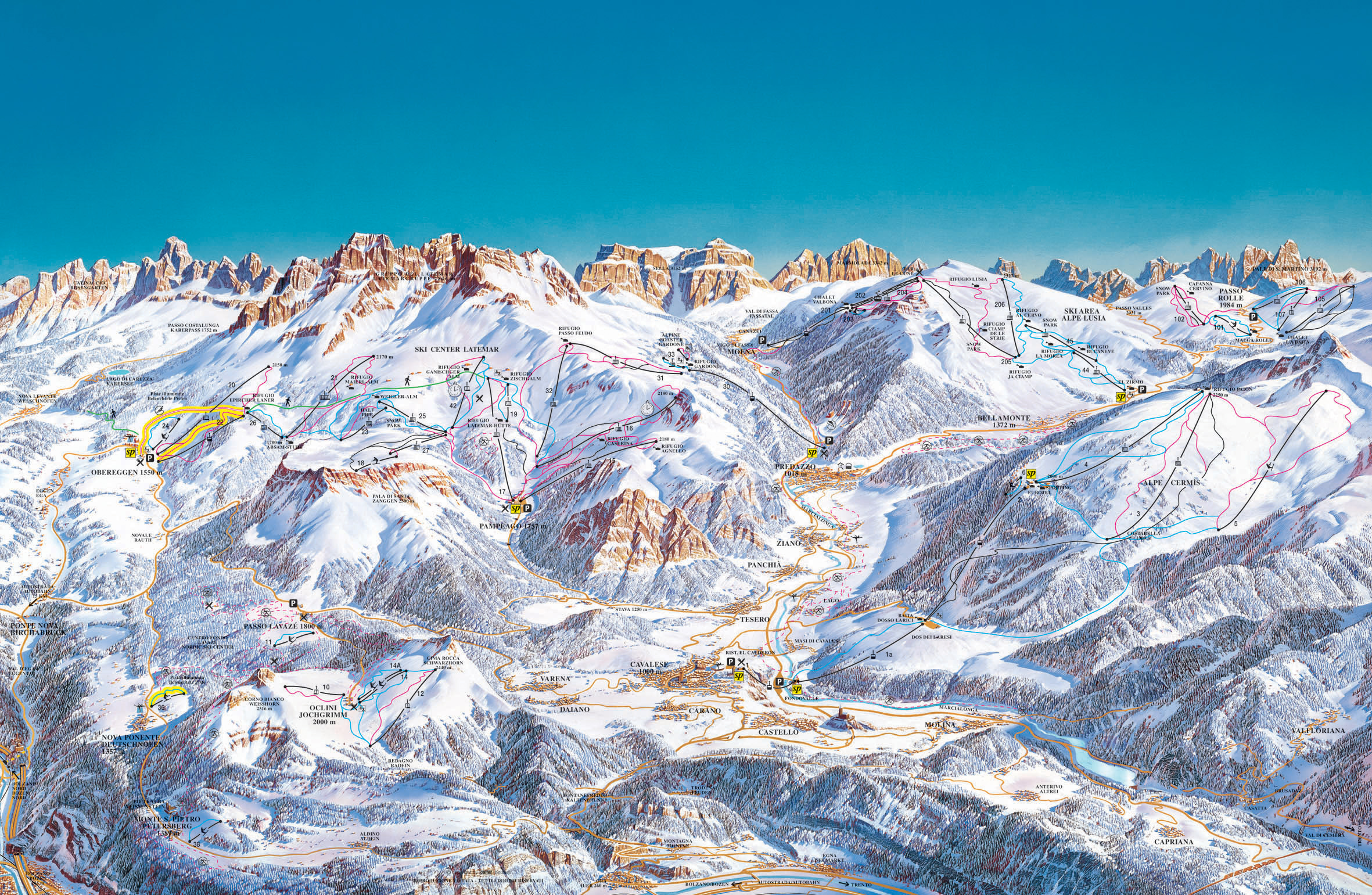 Přes 100 km sjezdových terénů různých náročností uspokojí jak rodiny s dětmi a začínající lyžaře, kteří můžou lyžovat na Bellamonte – Alpe Lusia nebo ve ski areálu Ski Center Latemar, tak i náročné lyžaře, vyhledávající adrenalin na černých sjezdovkách, který může nabídnout například jedna z nejdelších – 6 km dlouhá příkrá "černá" sjezdovka Olimpia na Alpe Cermis.